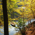 Ať už do ulice Na buku přijedete autem a nebo dorazíte po necelých 30 min autobusem z Prahy ze Smíchovského nádraží, určitě se nezapomeňte rozhlédnout přímo na parkovišti na protější domy, kde v jednom z nich mají místního maskota – místo hlídacího psa mají hlídacího vepře, u kterého se vždy zastavují turisté. Věřím, že ho ještě nesnědli 🙂 . Celá turistická trasa pak začíná o 100 m dále na konci vyasfaltované ulice, kde se napojíte na modrou turistickou značku a zároveň na Naučnou stezku Svatojánské proudy. Hned na začátku trasy přejdete přes maličký mostek ohromné potrubí přečerpávací vodní elektrárny Štěchovice, jejíž horní část uvidíte na konci výletu. Za dalších pár metrů se ale již ocitnete v nádherné přírodě a po chvíli se napojíte na zelenou turistickou trasu a pokračujete neustále podél břehu Štěchovické přehrady. Cestou půjdete jak po lesní pěšině hned u hladiny, tak i poměrně vysoko položenou kamenitou stezkou. Zatímco si budete užívat výhledy na protější břeh, znenadání se před Vámi objeví první chatky a sruby přímo v lese patřící k některé z četných trampských osad, které budete míjet podél celé přehrady. Když přijdete lesem v sobotu nebo v neděli ráno do nejznámější osady Ztracenka, budete asi hodně překvapení, kolik místních tu po ránu uvidíte pít na zápraží své chatky čaj. Osada Ztracenka se dříve nazývala jako Údolí ztracené naděje a je nejstarší trampskou osadou u nás, kde se trampové scházeli již před první světovou válkou. Osada původně stála přímo u břehu Vltavy u peřejí Svatojánských proudů, které byly i spolu s původní osadou zaplavené s výstavbou Štěchovické přehrady. Dnešní osada je tak již položená výše. Duše romantika si možná zasteskne, že peřeje Svatojánských proudů, po kterých je pojmenován celý kaňon Vltavy mezi Slapy a Štěchovicemi, zmizely nenávratně pod hladinou, ale právě díky přehradě je okolní příroda zachovalá a prakticky odříznutá od okolního světa, protože tudy nemohly vést žádné silnice.